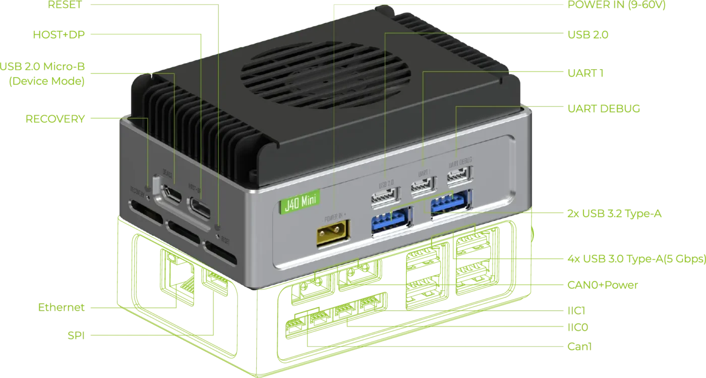 - 手掌大小的邊緣 AI 設備:尺寸緊湊,尺寸為63mm x 95mm x 66.7mm ,配備 NVIDIA Jetson Orin NX 16GB模組、Mini J401 載板、風扇和外殼。支援桌面和壁掛式安裝。