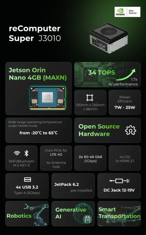 reComputer Super J3010 是一款緊湊型高效能邊緣 AI 設備,基於 NVIDIA® Jetson™ Orin™ NANO 4GB 平台,在 Super MAXN 模式下可提供高達 34 TOPS 的算力。它支援 -20℃ 至 65℃ 的寬溫範圍。具備Wi-Fi/BT/LTE 無線通訊功能和乙太網路連接埠。