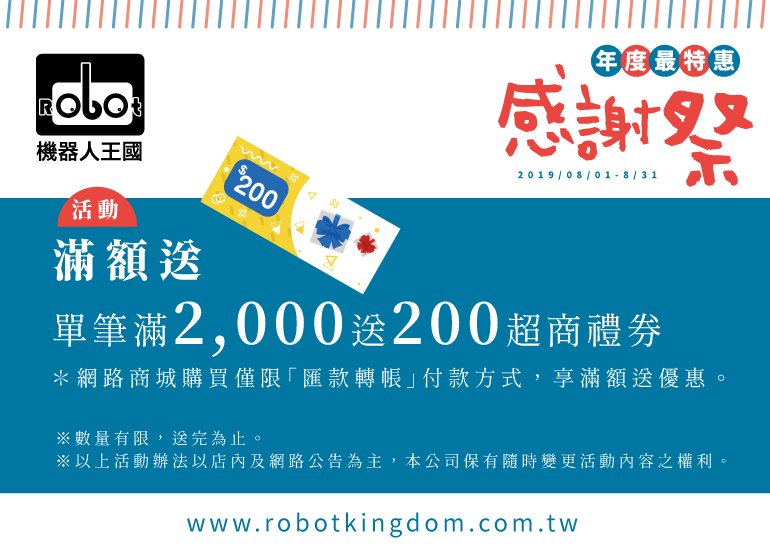 地址:台北市中正區寧波東街1號4樓 電話:(02)23062900 營業:9:30-18:30, 週一到週五 電郵:service@robotkingdom.com.tw 聲明:翰尼斯企業有限公司(29070497)為正式註冊之法人 CAVEDU為其教育部門 RobotKingdom則為其零售部門。